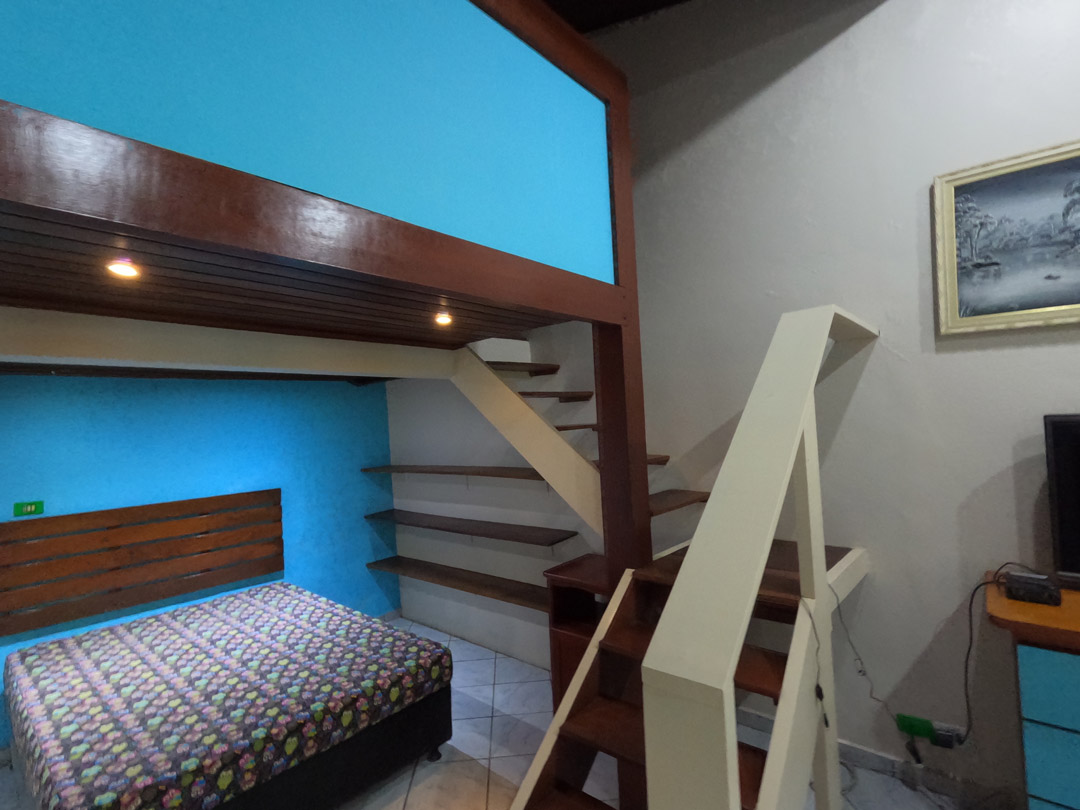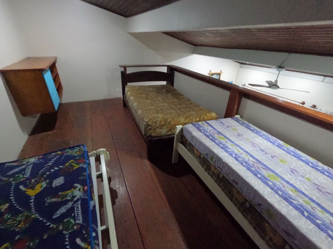 A Casa tem dois andares com uma cama de casal no primeiro andar e dois beliches e uma cama de casal no andar de cima.