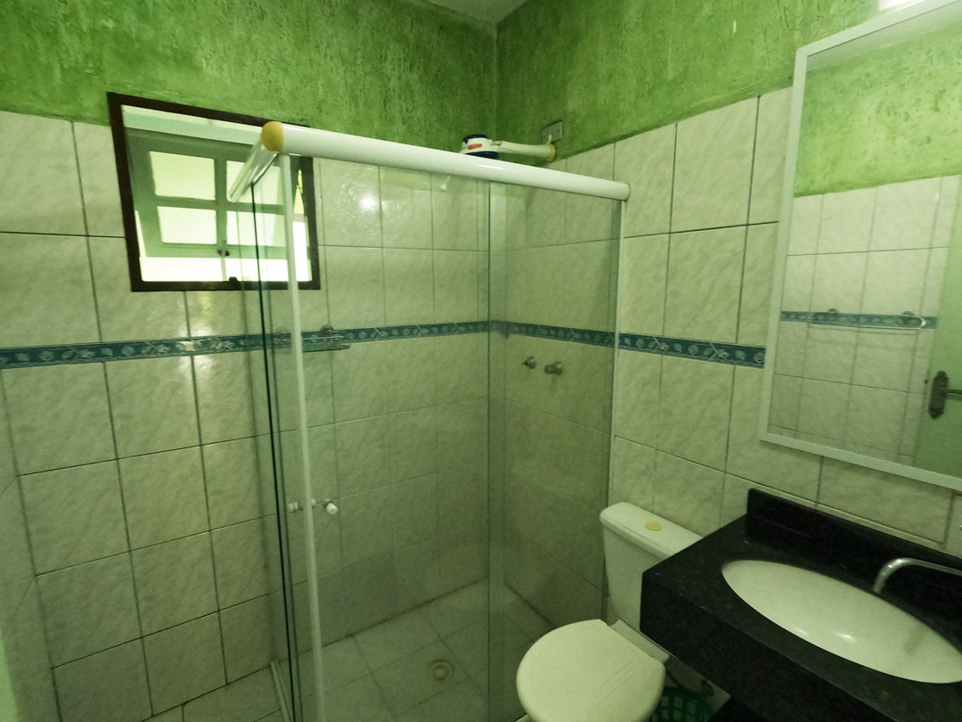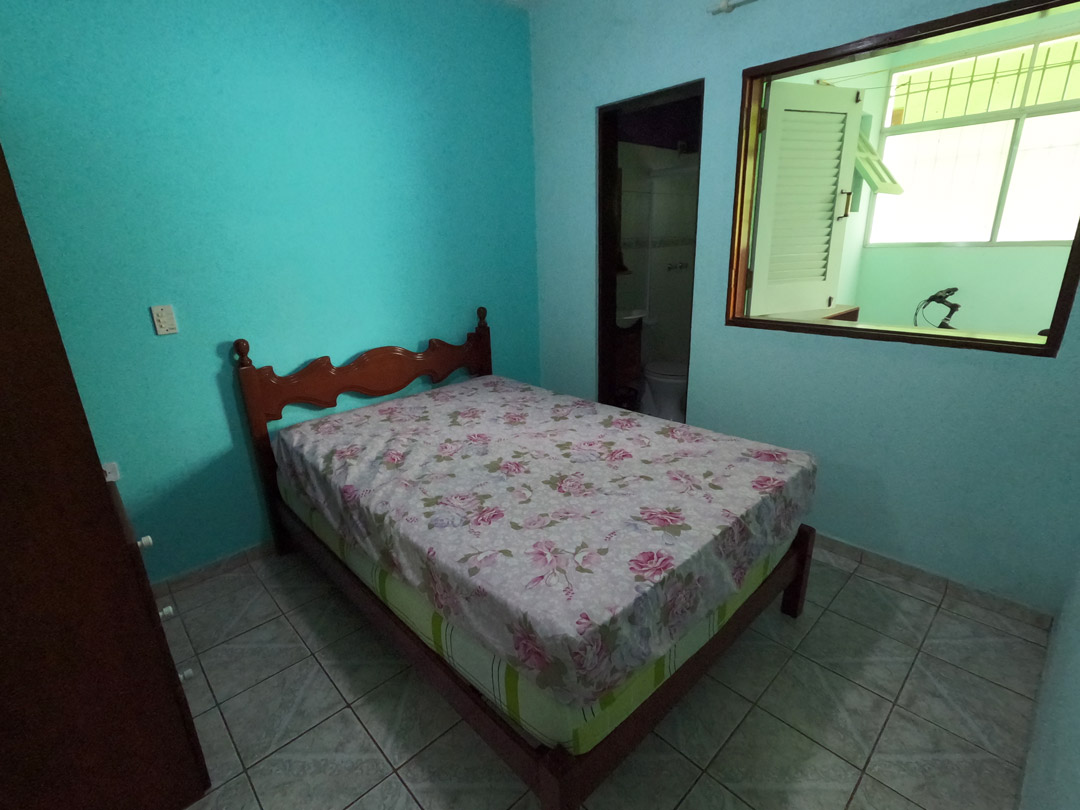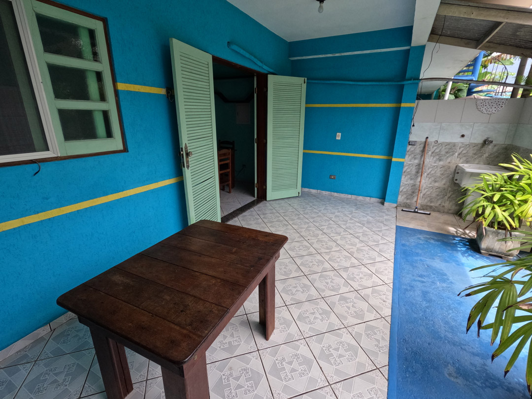 A casa tem um quarto de casal, um quarto com beliches, varanda com mesa, cozinha completa, dois banheiros e lavanderia