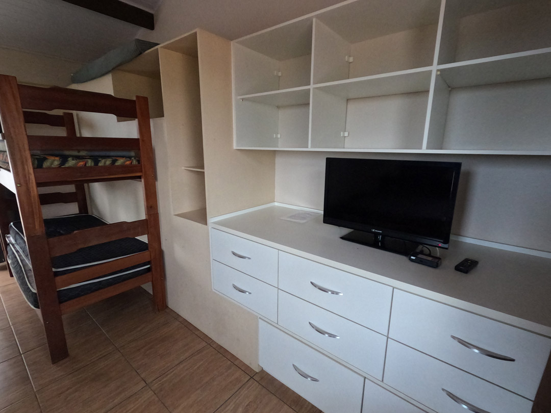 O apartamento tem uma cama de casal, um beliche, cozinha completa, um banheiro e lavanderia.