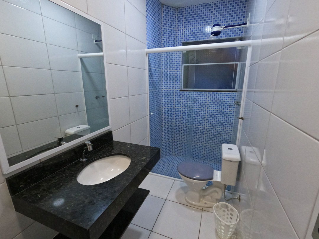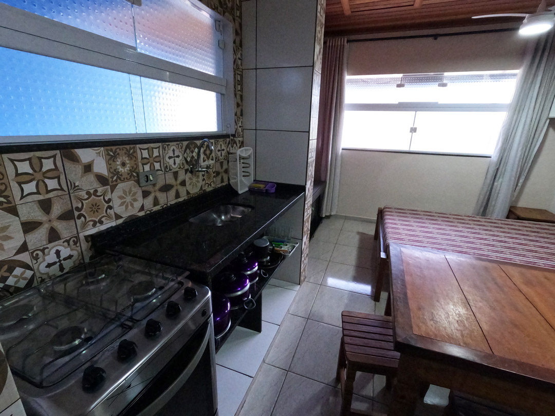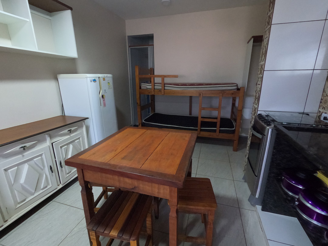 O apartamento tem uma cama de casal, um beliche, cozinha completa, um banheiro e lavanderia.