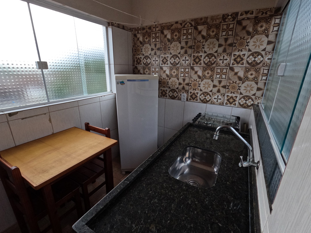 O apartamento tem uma cama de casal, um beliche, cozinha completa, um banheiro e lavanderia.